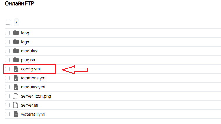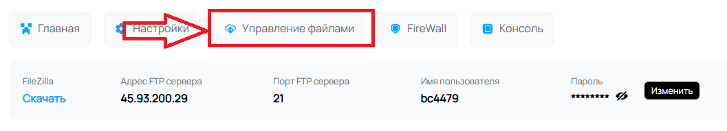 Шаг №1Переходим в панель управления BungeeCord и нажимаем на кнопку "Управление Файлами".
