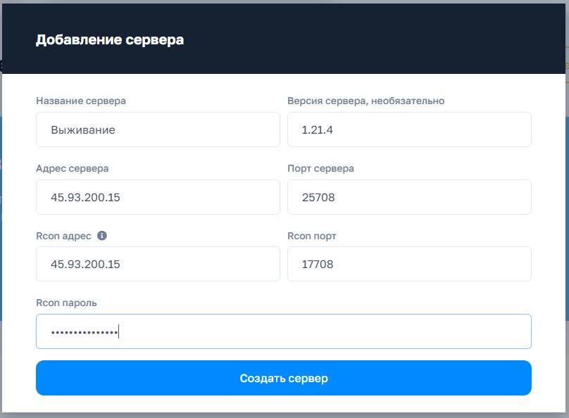 RCON пароль указываете тот, который Вы прописали в конфиге сервера «server.properties» в параметре rcon.password.
