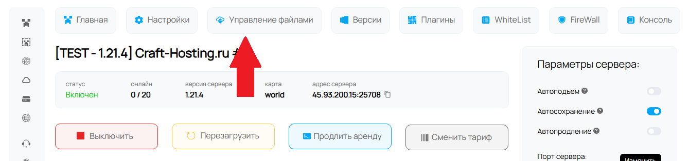 Открываем панель управления сервером на хостинге и заходим во вкладку «Управление файлами».
