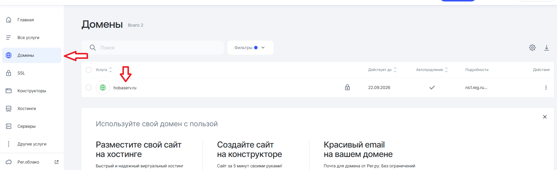 На сайте reg.ru после авторизации заходим во вкладку «Домены» и жмём на Ваш купленный домен.