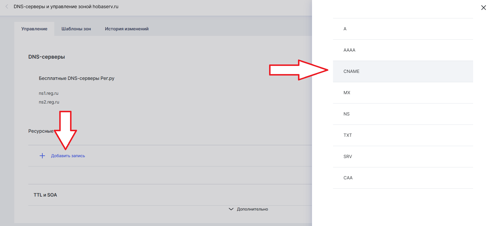 На открывшейся странице ищем «Добавить запись» и далее выбираете CNAME