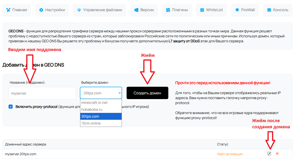 Рассмотрим на примере созданного поддомена myserver.20tps.com на гео-прокси.