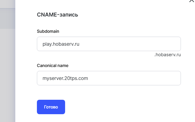 Для настройки своего домена нам нужно создать поддомен с типом CNAME и значением myserver.20tps.com