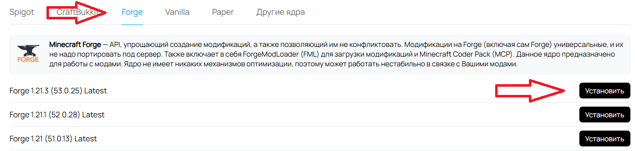 Шаг №2Выбираем вкладку "Forge" и жмём кнопку "установить" напротив нужной Вам версии.