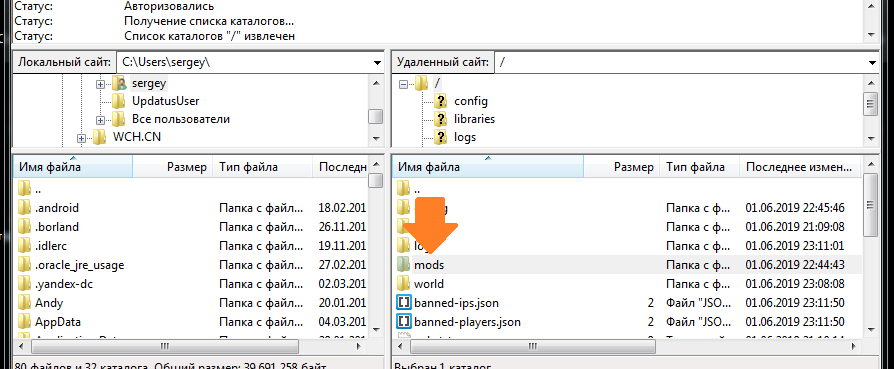 Шаг №4После успешлого запуска сервера подключаемся к FTP Вашего сервера и загружаем моды в папку mods.